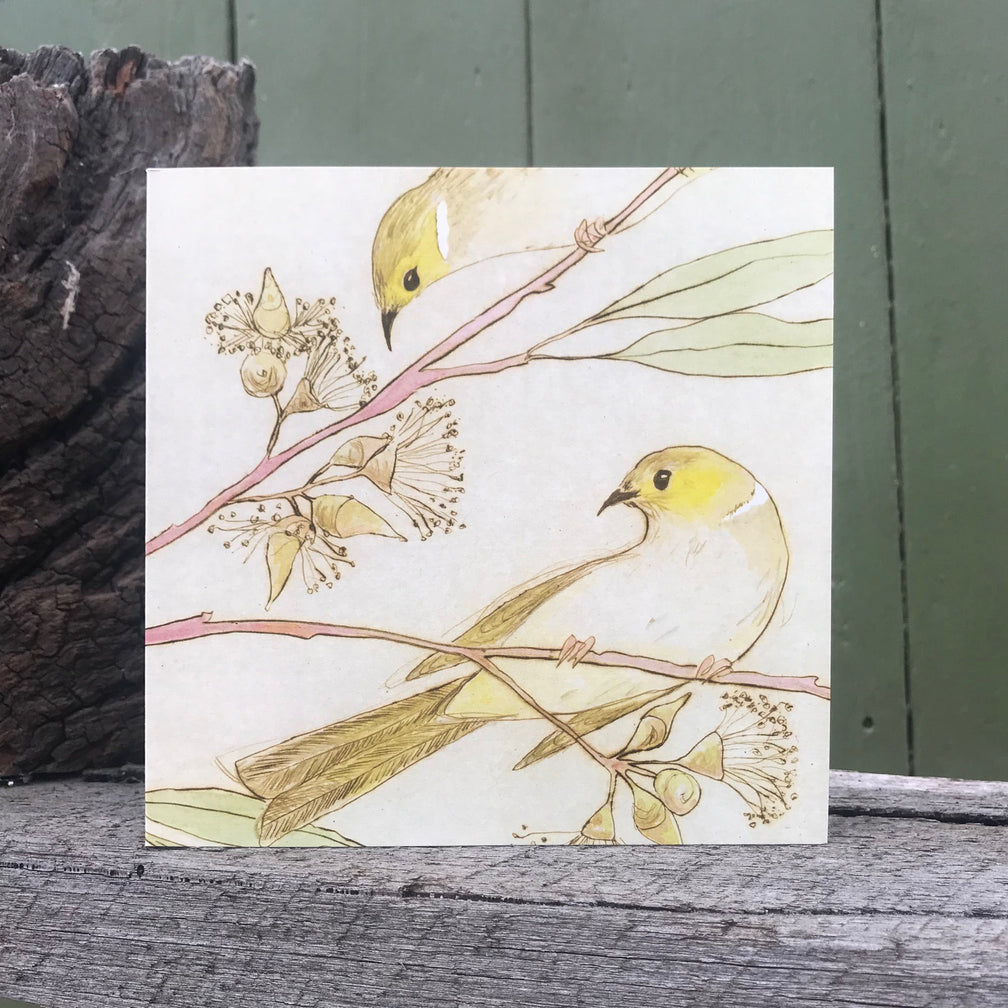 Each card measures 14 x 14cm in size and is blank inside. Printed with eco inks on recycled card in regional Victoria. It comes with a dark cream envelope.