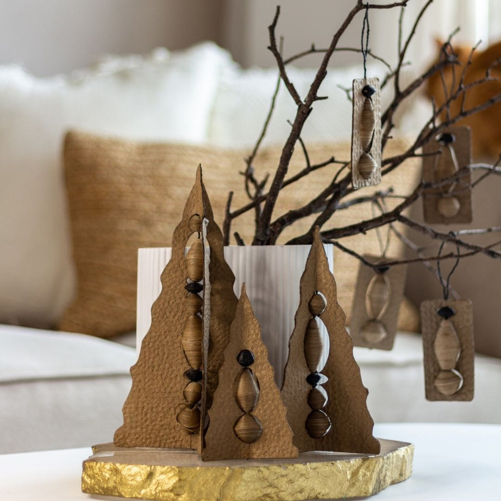 For those who don't go in for ornate home decor, simple set pieces like these natural hand made paper trees fit the festive bill.