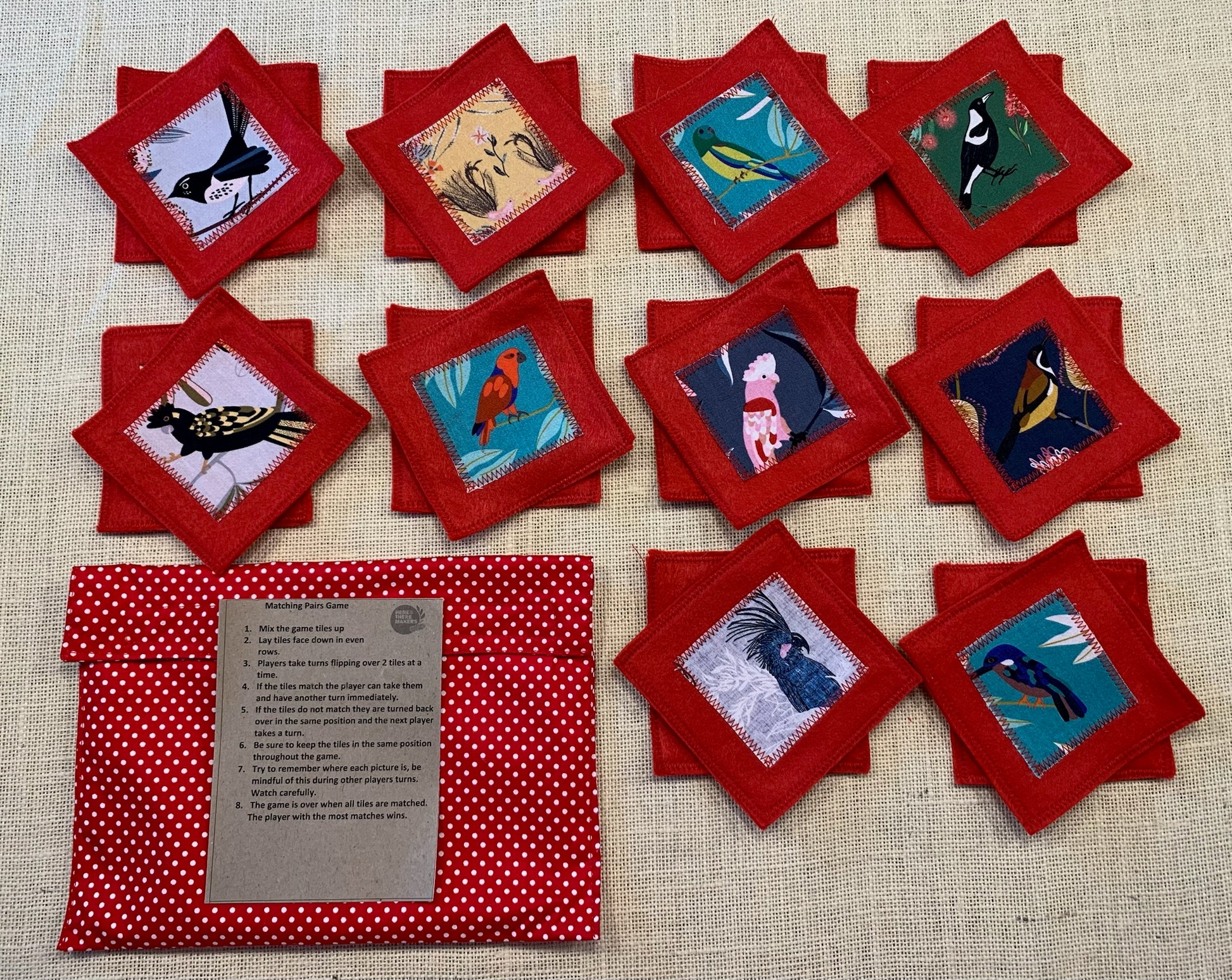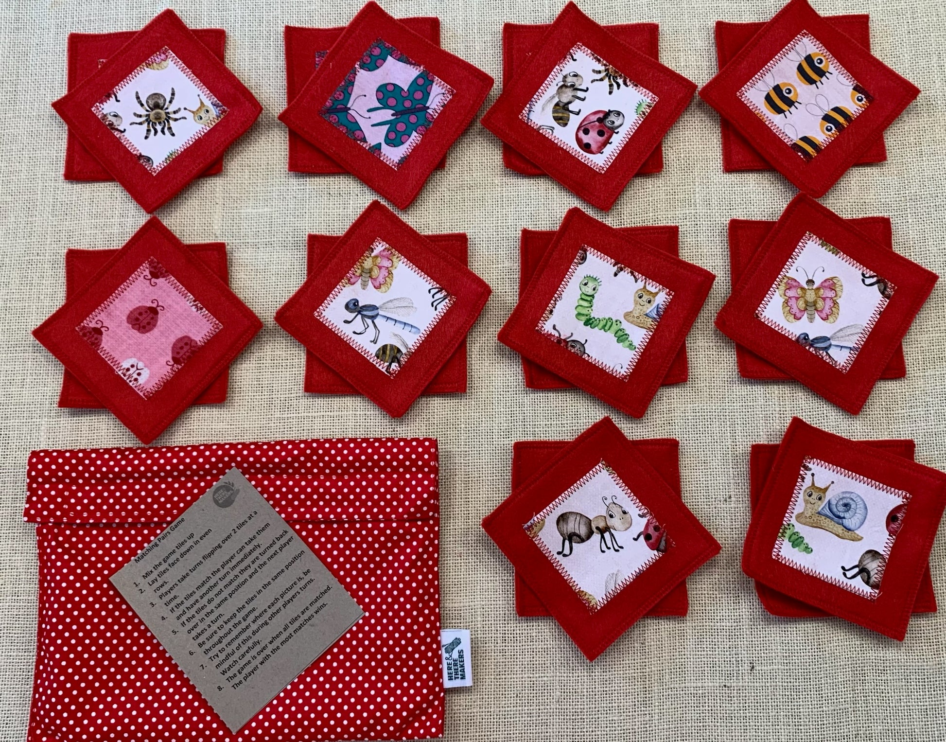 10 Sets of fabric picture tiles to play a memory-matching game.