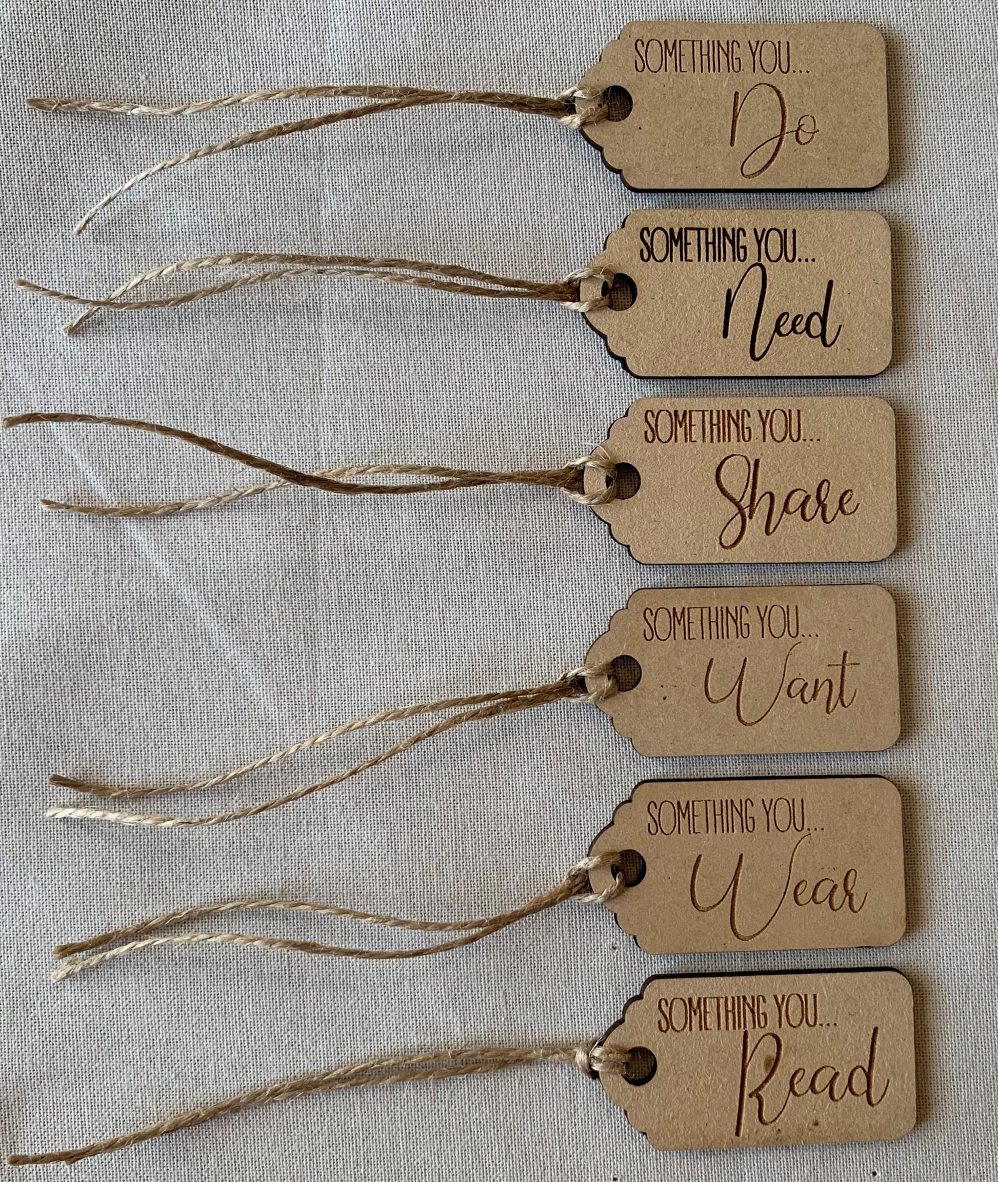 Each set of 6 tags comes with Something You: Wear, Read, Do, Share, Want, Need. Each tag is 6cm x 3cm, 3mm deep with a hole for you to tie your favourite string, ribbon or twine to match your wrapping, although we include some natural jute string for you.